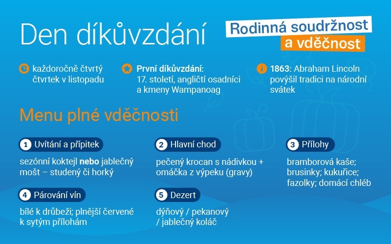 - Den díkůvzdání se slaví také mimo USA, například v Kanadě (říjen), a v některých evropských restauracích se nabízí tzv. Thanksgiving menu?