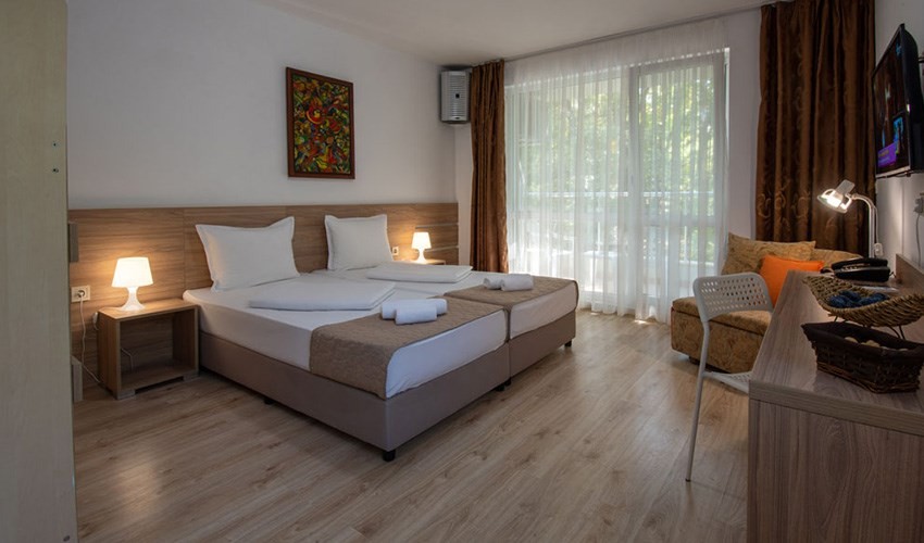 Dobře vedený rodinný hotel je situován na klidném místě, v severní části malebného letoviska Kiten, jen 250 m od pěkné písčité pláže. Nákupní možnosti a zábavu mají hosté ve 450 m vzdáleném centru letoviska (obchody, restaurace, bary, kavárny, půjčovny motocyklů a automobilů, vodní sporty na pláži, zastávka místní dopravy). Mezinárodní letiště Burgas je vzdáleno 65 km.Vybavení