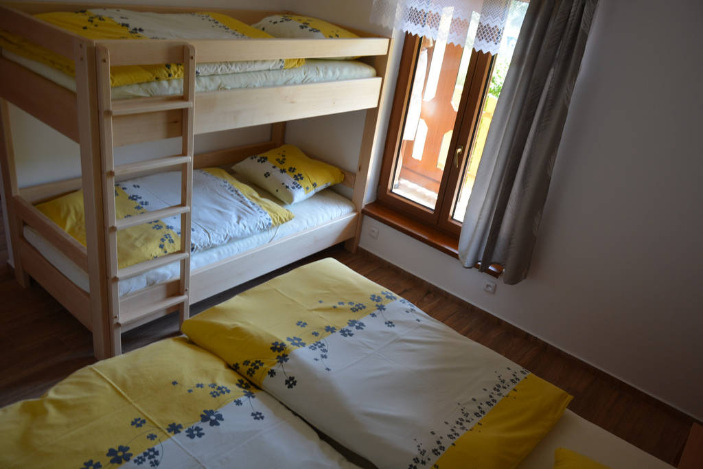 Starší samostatná chata pro 5 osob. Ložnice s 2x patrovou postelí. Gauč v jídelně.
