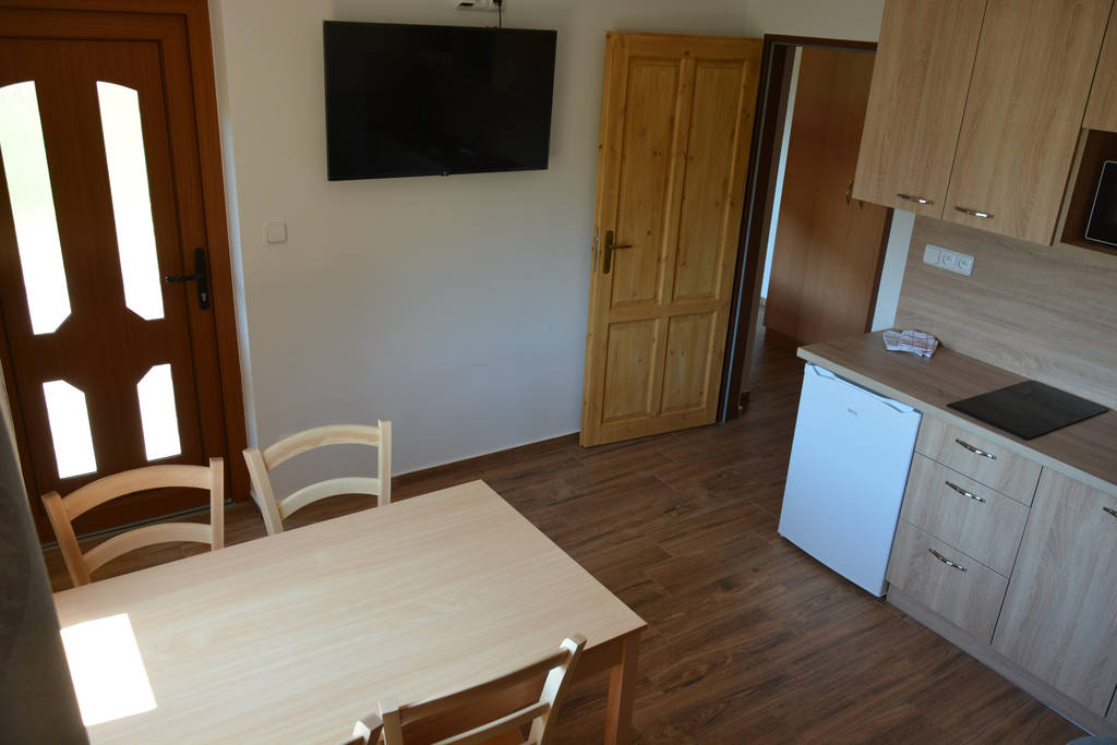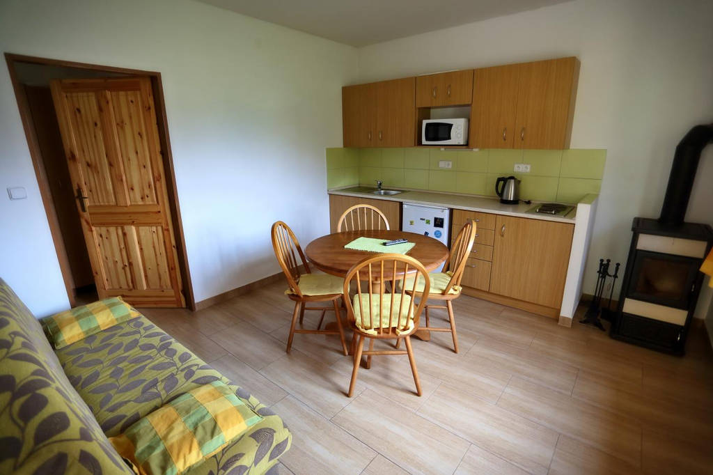 Starší samostatná chata pro 5 osob: Ložnice se dvěma patrovými postelemi. Jídelna s TV a gaučem (lůžko pro 5. osobu). Samostatná kuchyně s vybavenou kuchyňskou linkou, chladnička, plynový sporák s troubou, varná konvice, mikrovlnná trouba, hygienické zařízení.Venkovní terasa s posezením.