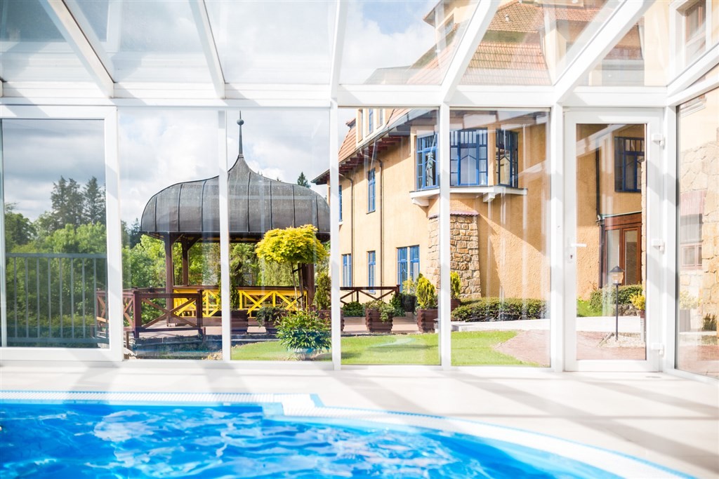 • 2 bazény - vnitřní bazén s protiproudem propojený s vnějším bazénem