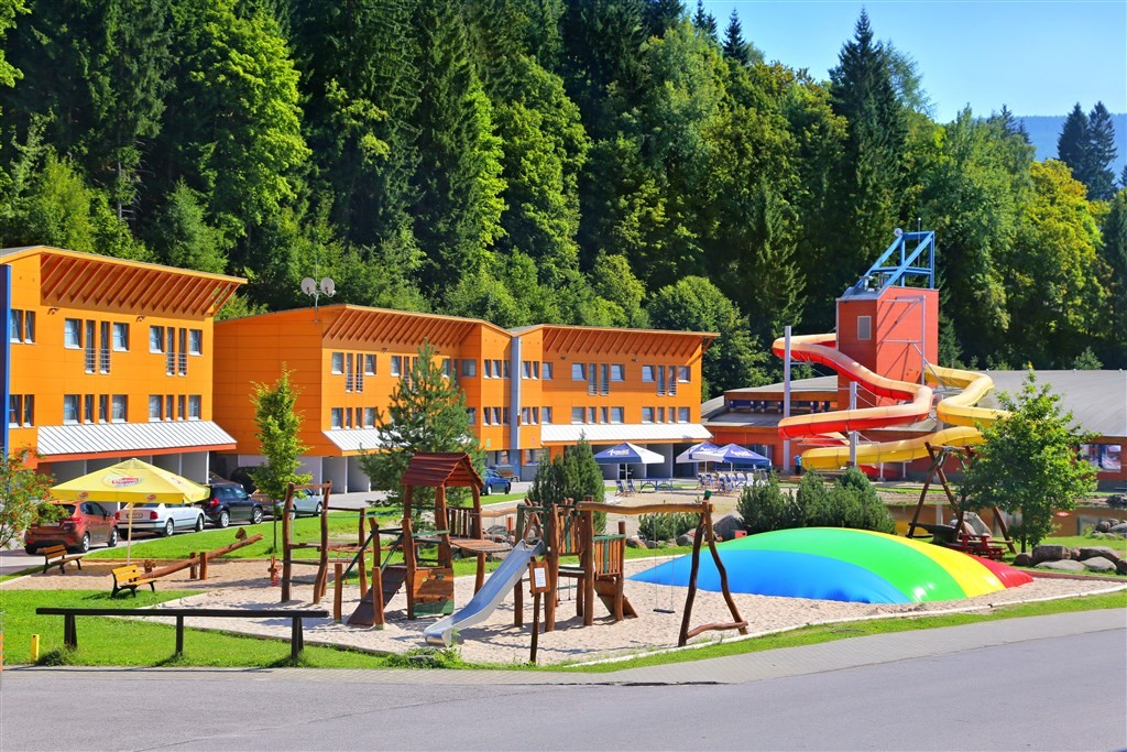 AQUAPARK V AREÁLU - rekreační bazén, dětské brouzdaliště, tři tobogány včetně člunového tobogánu, malá a velká vířivka, divoká řeka, vodní chrliče.
