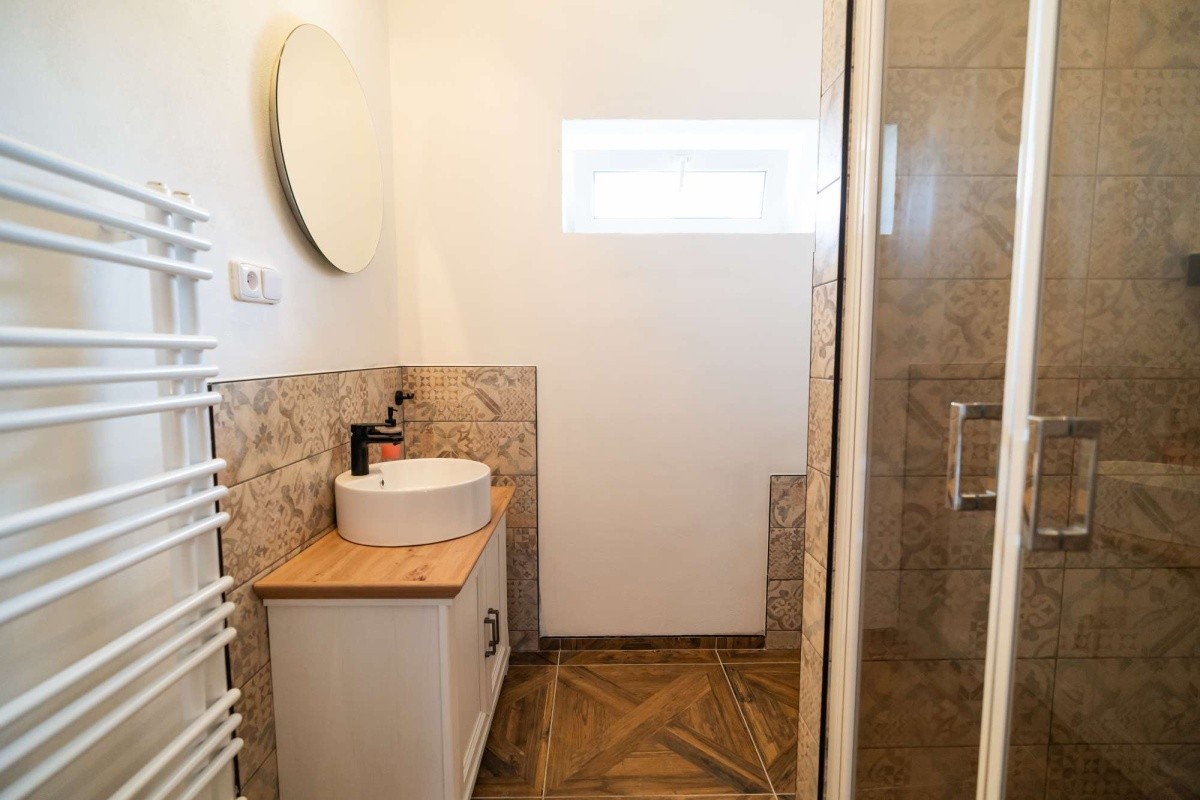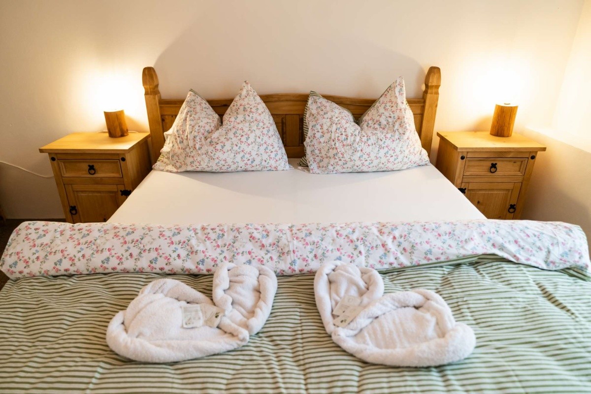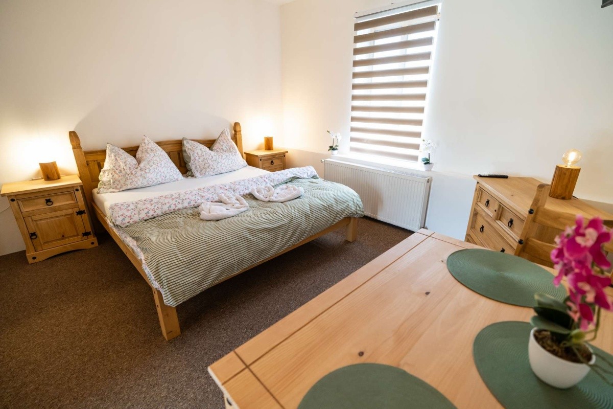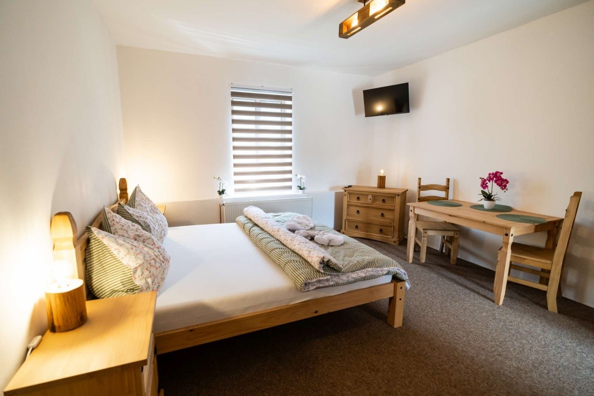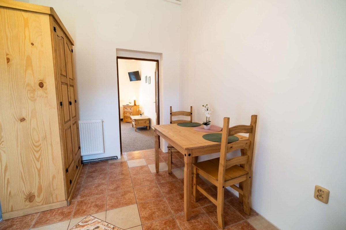 Dvoulůžkový apartmán v podhradí, s možností až dvou přistýlek, vlastním sociálním zařízením, rychlovarnou konvicí, miniledničkou, mikrovlnnou troubou, TV/SAT, připojením k internetu přes Wi-Fi. Velikost apartmánu je 50 m².