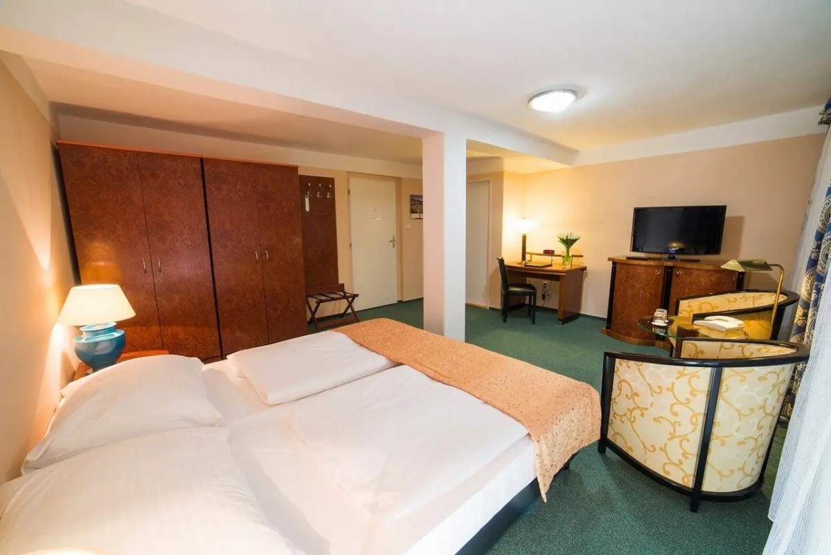 Pokoje Standard: Příznivá cena a více prostoru oproti pokojům Economy Plus dělají tuto kategorii u hostů velmi oblíbenou. Okna nabízí výhled do Husovy ulice, která vede přímo do historického centra Františkových Lázní.
