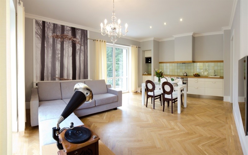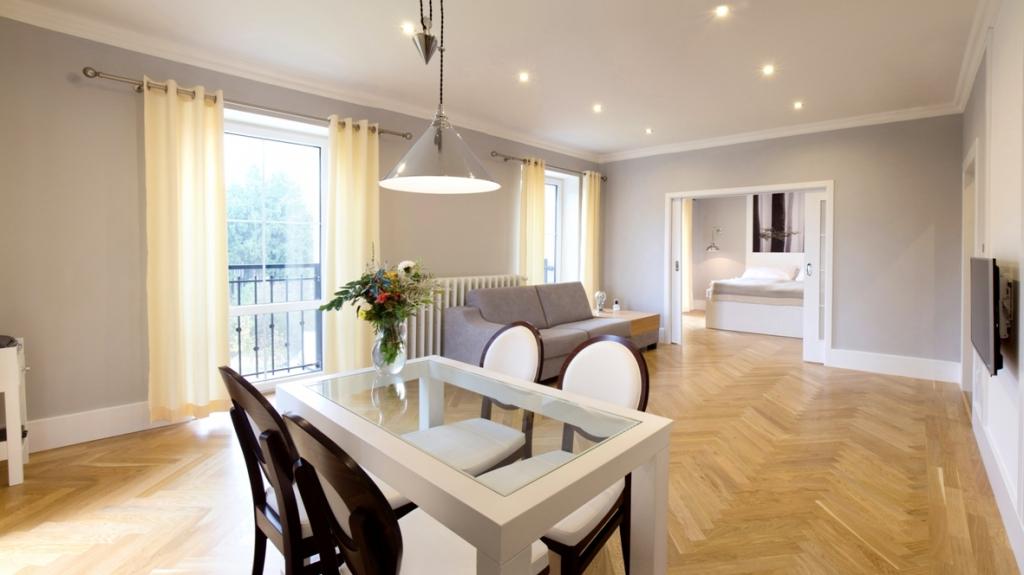 v apartmá Standard je 1× dvoulůžko, rozkládací pohovka s odkládacím stolkem a zabudovanou lampou, smart TV s webovým prohlížečem a vestavěnou Wi-Fi, 39“, gramofon, USB, MP3 přehrávač, rádio, budík, telefon, vybavená kuchyňská linka včetně varné desky, trouby a lednice, prostorná koupelna s 2 umyvadly, WC a sprchovým koutem, župany, osobní váha a fén, pokojový trezor.