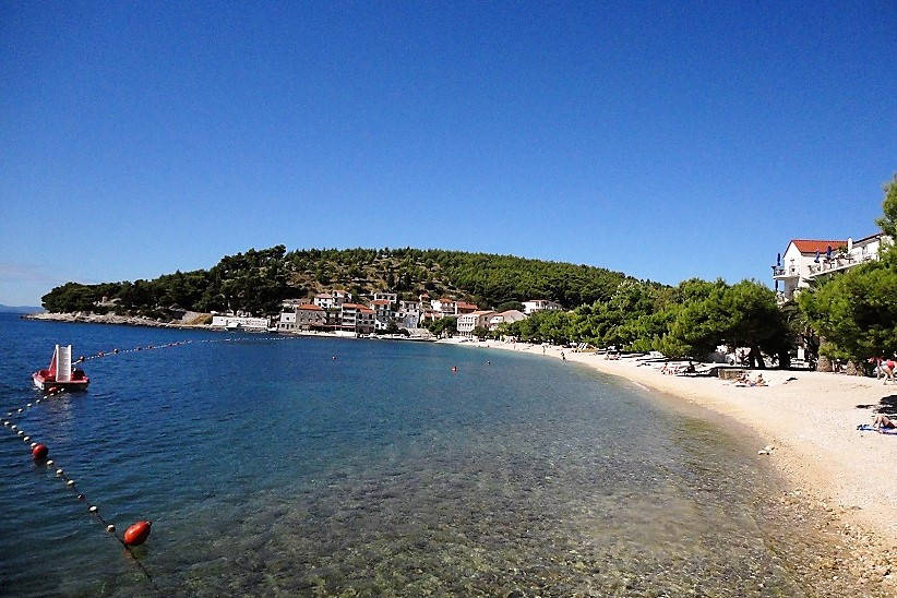 Pláž je oblázková, na můj vkus ale celkem malá. Záměrně jsme jeli do Chorvatska před začátkem sezóny a překvapilo nás celkem velké množství lidí, kteří na pláži byli. (Během hlavní sezóny to musí být "hlava na hlavě"). Vzhledem k brzkému vstávání našeho dítěte, jsme na pláži byli už brzo ráno a pravidelně jsme se potkávali s pánem, který pláž uklízel.