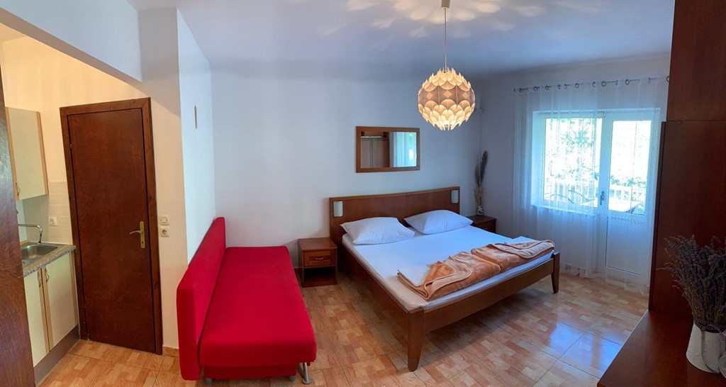 - Třílůžkové studio - disponuje vlastní koupelnou, Wi-Fi, klimatizací, kompletně vybavenou kuchyní s jídelním koutem a balkonem s výhledem na pohoří Biokovo.