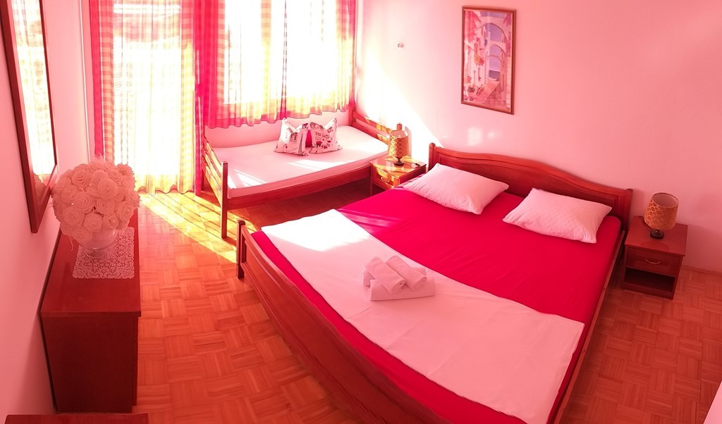 - Čtyřlůžkový apartmán s možností až 2 přistýlek - disponuje 2 samostatnými ložnicemi, vlastní koupelnou, Wi-Fi, klimatizací, oddělenou kompletně vybavenou kuchyní s jídelním koutem a balkonem s výhledem moře.