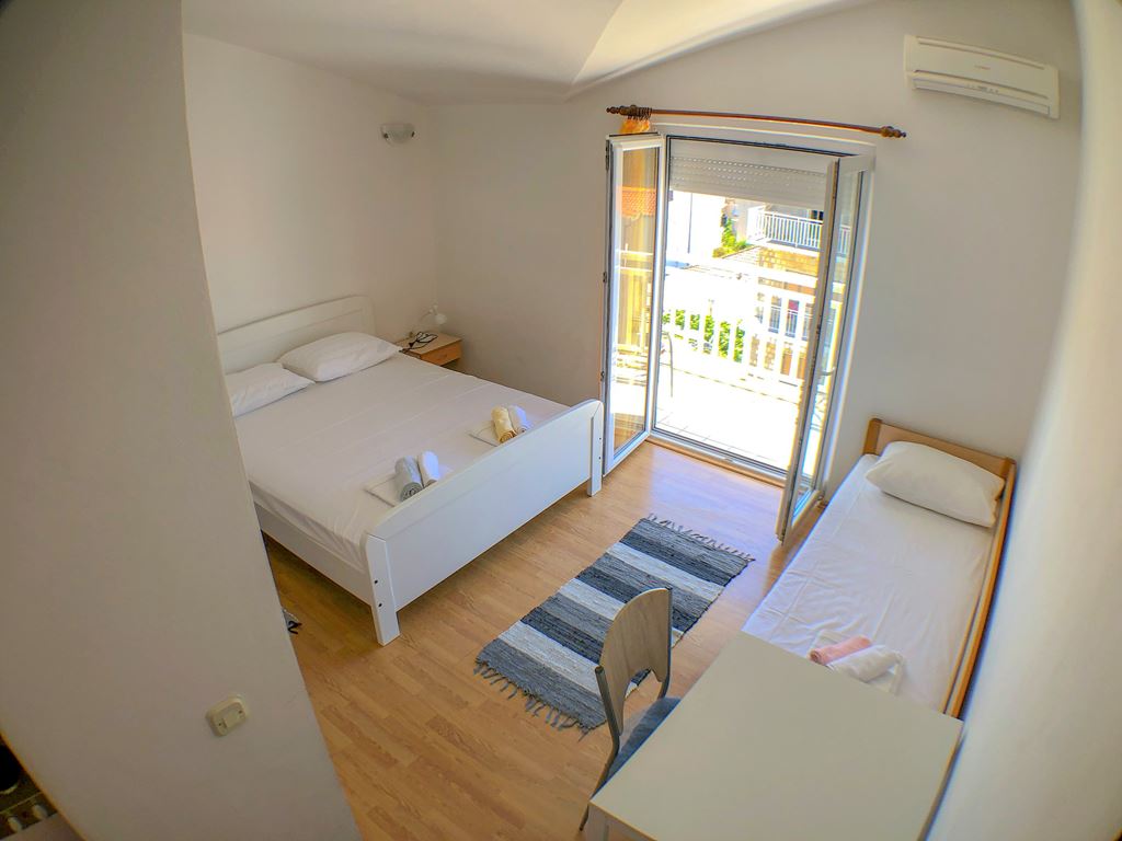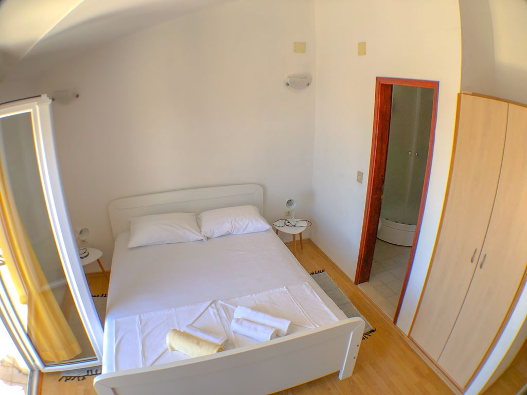 pěkný moderní prostorný apartmán se skládá ze dvou místností, kde jedna ložnice má manželské lůžko a druhá ložnice (v nice) má oddělená pevná lůžka. Součástí vybavení je vlastní sociální zařízení (koupelna se sprchovým koutem a WC), klimatizace v každé místnosti (zdarma) a wi-fi v ceně, kuchyně (lednice, trouba, kuchyňské vybavení pro základní stolování a přípravu jídla), jídelní stůl, dva balkony s venkovním posezením. Nachází se v 1. patře.