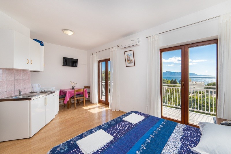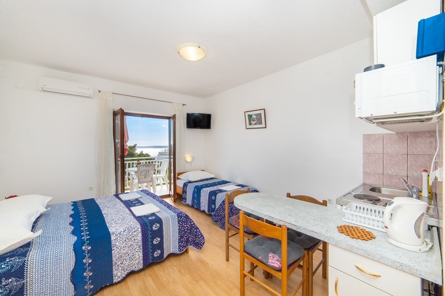 Všechna studia a apartmány mají vybavený kuchyňský kout, sociální zařízení, SAT TV, WiFi zdarma a balkon. Klimatizace je za poplatek 5 EUR/den. Studio pro 2 osoby ST2 - má 2 lůžka v denní místnosti. Studio pro 3 osoby ST3 - má 2 lůžka a 1 přistýlku (rozkládací gauč) v denní místnosti. Apartmán pro 4 osoby AP4 - má 2lůžkovou ložnici 2 přistýlky (rozkládací gauč) v denní místnosti.