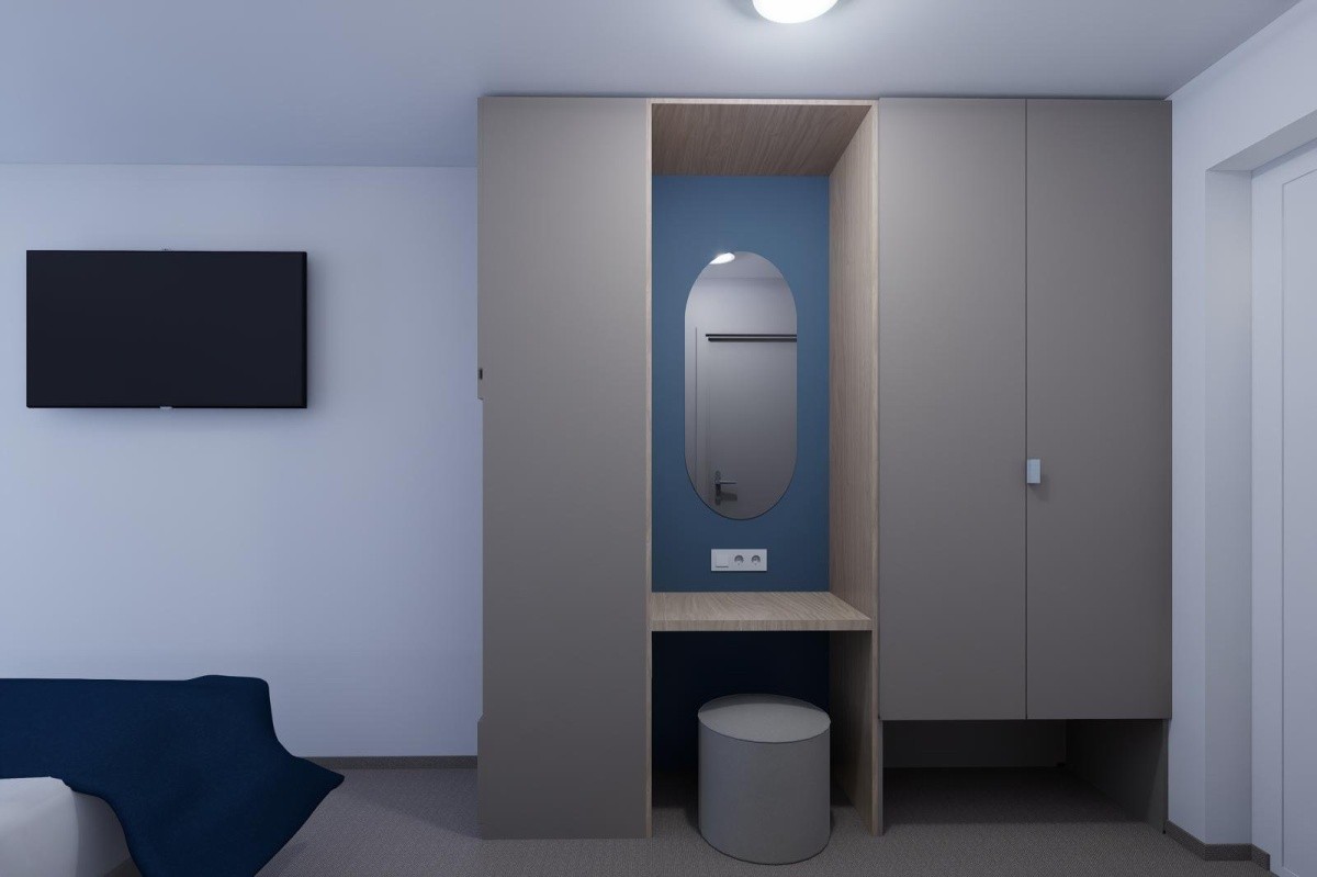 společenskou místností s TV, internetovým koutkem, parkovištěm. Pro sportovní