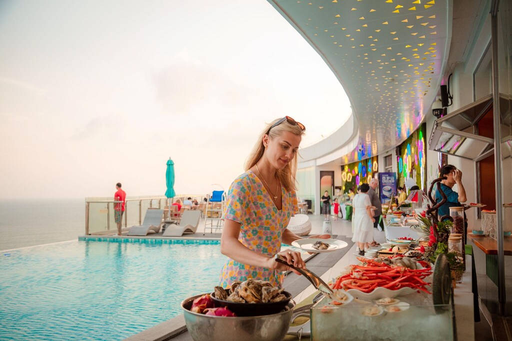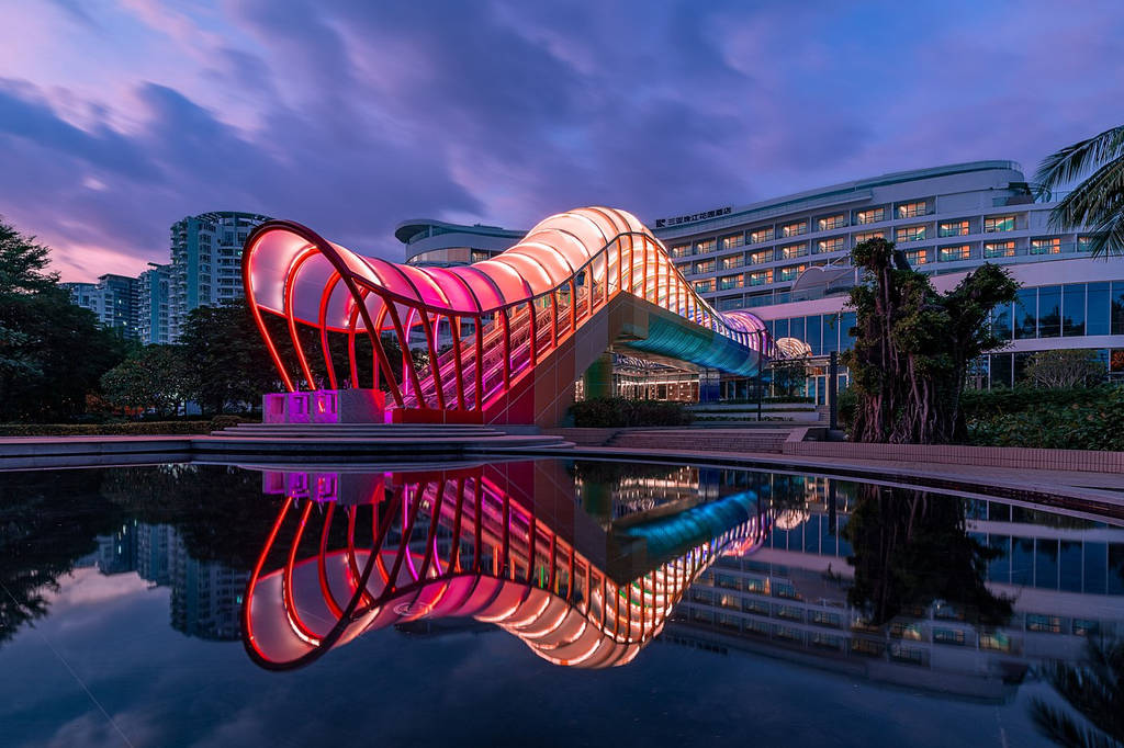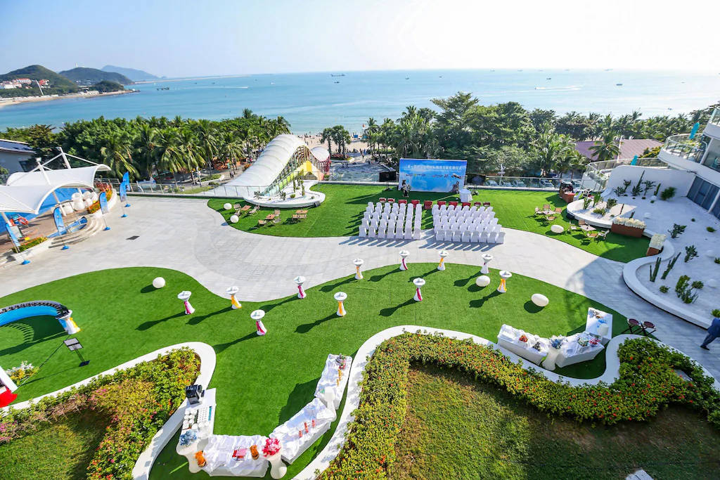 This hotel is located in Sanya, within walking distance of the beach, accessible via an overpass. It features swimming pools with sunbathing areas, including a rooftop with sea views, as well as restaurants and bars.
