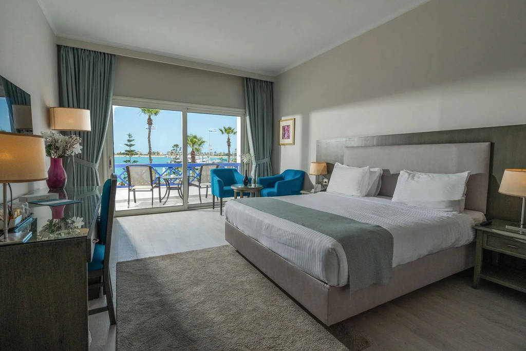 Junior suite s výhledem na moře – dvoupokojový apartmán se obývacím pokojem a ložnicí s manželskou postelí. K dispozici je jedna koupelna. Úchvatný výhled na moře.