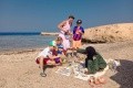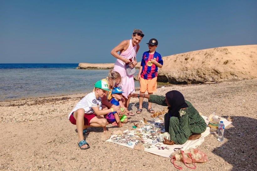 Zdejší pláž je pro mne naprosto ideální. Jemný, ale ne bořící se písek všude, od deštníků až k baru a sprchám, vstup do zátoky pozvolný a bez ostrých korálů. Zátoka je ve tvaru vany a po obou stranách jsou její útesy porostlé korály, které obývá velké množství krásných, korálových ryb. Najdete zde i želvy, murény, rejnoky i barakudy. Viděl jsem zde i dvě manty. Když se půjdete projít nahoru na písečné duny směrem k volnému moři, narazíte na levný přístřešek. Tam někdy prodává beduínská babička své korálkové náramky a náhrdelníky za dva až tři dolary. Foto z mobilu přikládám.