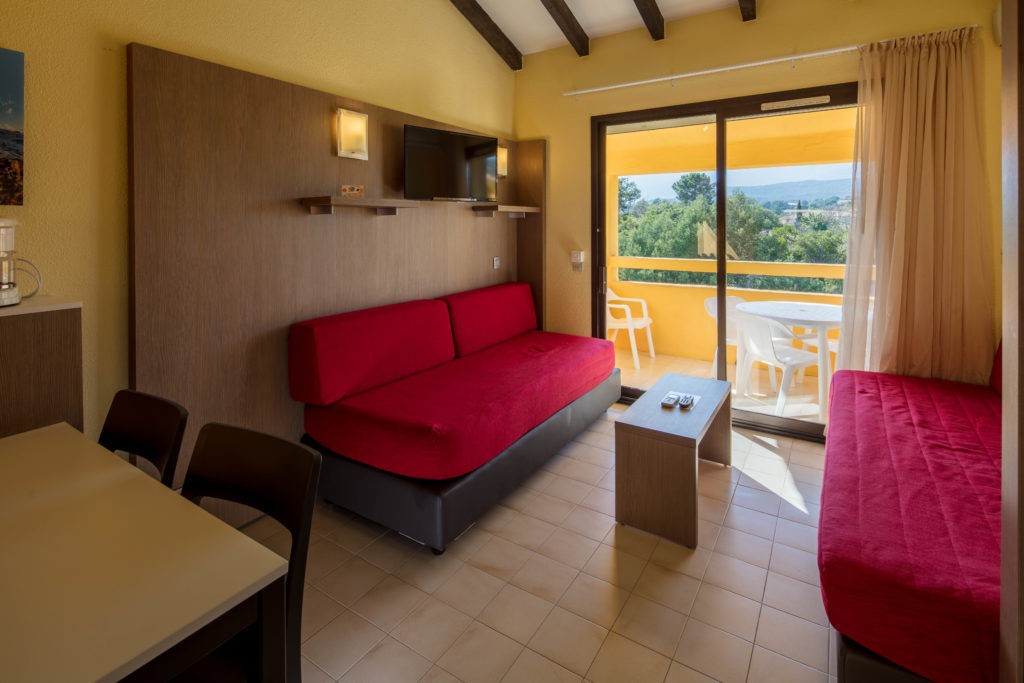 Apartmán 2P pro 2 – 4 osoby (31 m2): terasa vybavená zahradním nábytkem, obývací pokoj s kuchyňským a jídelním koutem, dvěmi rozkládacími lůžky, pokoj s dvojlůžkem (160×190 cm) nebo se dvěmi samostatnými lůžky (80×190 cm), LCD televizor, fén na vlasy, wifi připojení, koupelna, samostatné WC.