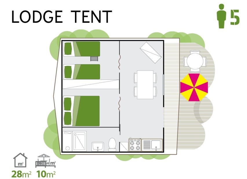 stan Lodge Tent Deluxe 5:ložnice s manželskou postelí, ložnice s patrovou postelí a samostatným lůžkem, obývací pokoj s kuchyňským koutem.