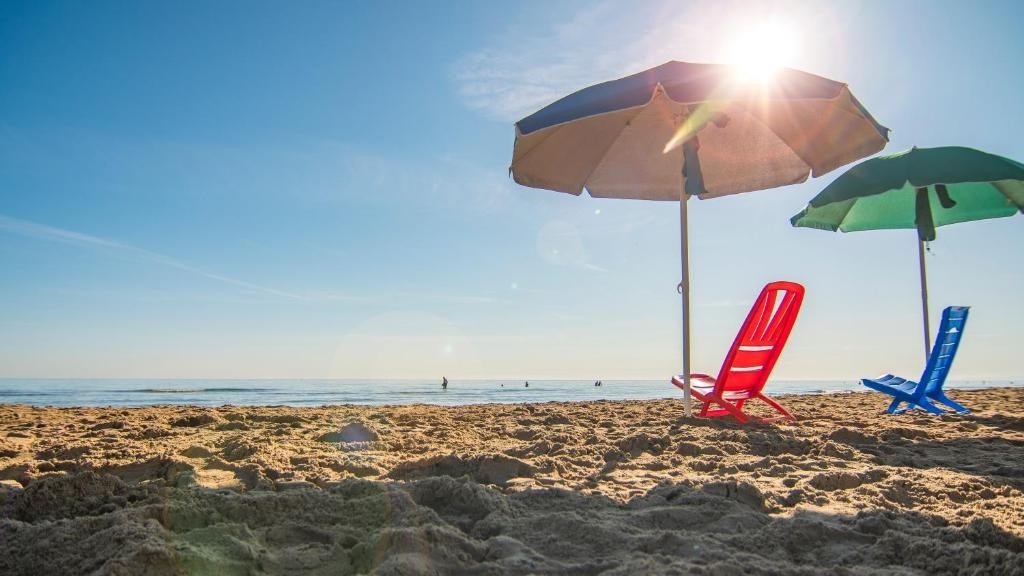 Nádherná více než 60 m široká pláž se nachází přímo před kempem a nabízí i množství sportovního vyžití (beach volejbal, dětské průlezky atd.). Klientům je k dispozici privátní pláž nebo blízké volné pláže. Sestup do moře je velmi pozvolný. Možnost půjčení lehátek a slunečníku – za poplatek.Neoficiální popis ubytování