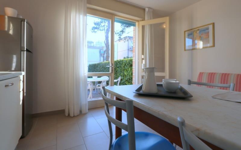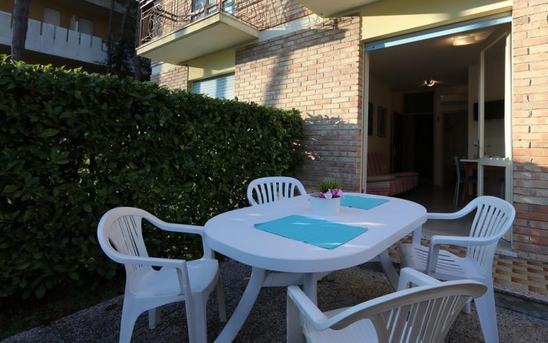 cca 450 m od pláže. Plážový servis od 4. radu v období 1.5.-30.9. (1 slnečník + 1 lehátko + 1 plážová stolička/apartmán). V časti Bibione Pineda bude plážový servis dostupný od polovice mája do polovice septembra.