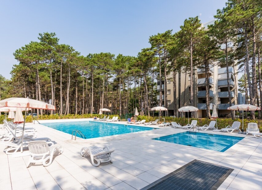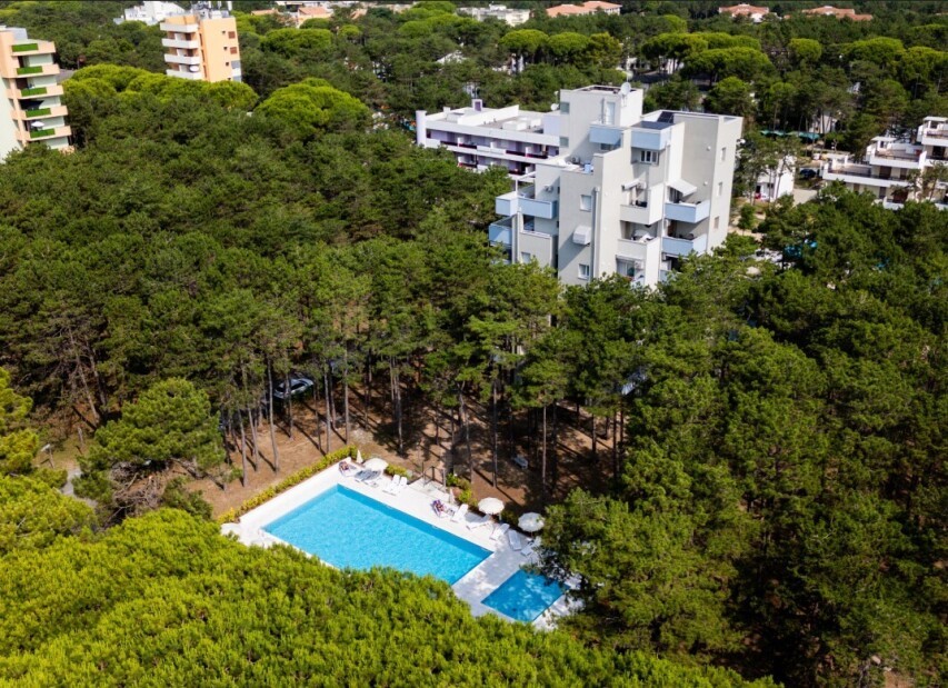 Residence ACCADEMIA (Via Mozart) obklopená piniemi svým klientům nabízí bazén, dětský bazén, výtah, společnou zahradu a kryté parkoviště. Apartmány mají vlastní sociální zařízení, TV, klimatizaci (za poplatek). Typ B1 bilo 4 je zrenovovaný a má navíc mikrovlnnou troubu, myčku a bezpečnostní dveře. Ke každému apartmánu náleží číslované parkovací místo.