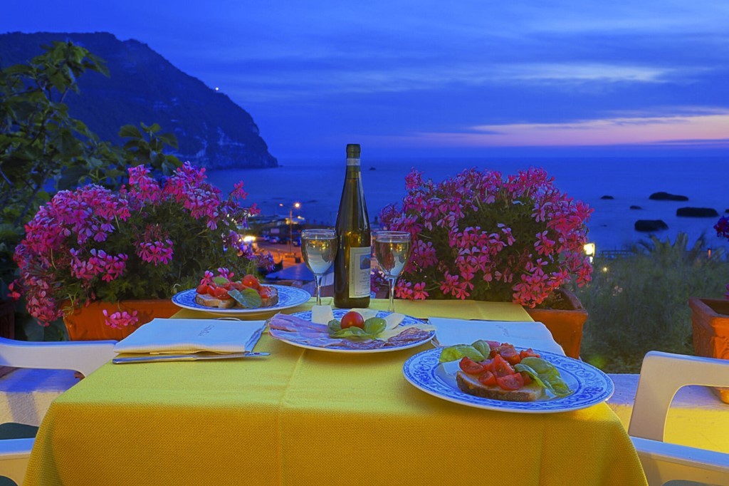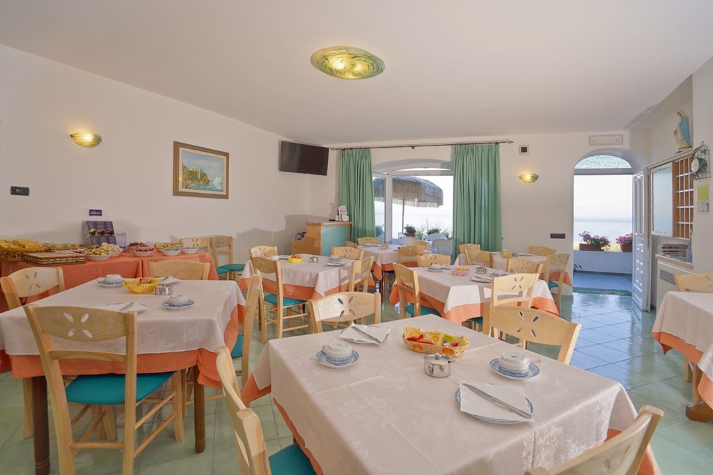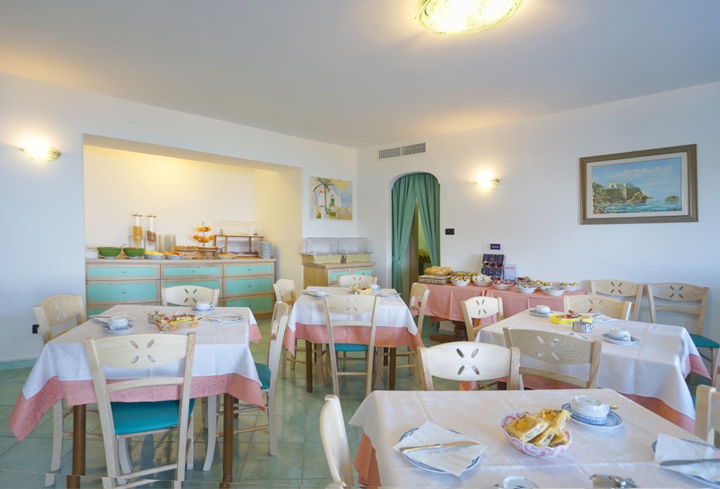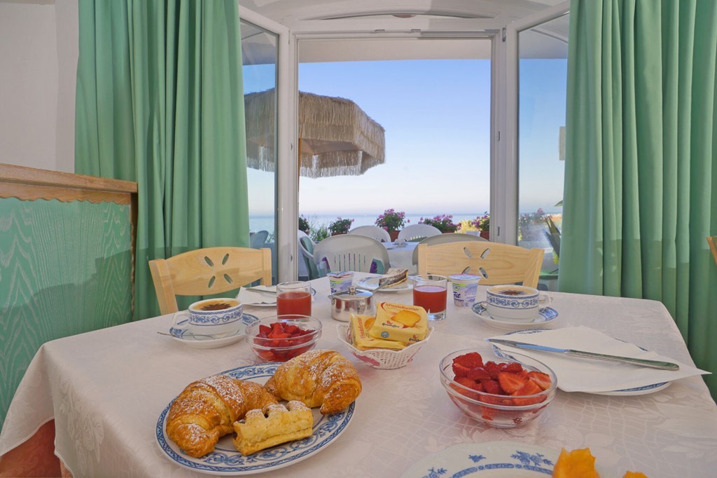 Bohatá snídaně formou bufetu se podává na panoramatické terase s výhledem na zátoku Citara a Punta Imperatore. Navíc díky speciálním dohodám s řadou plážových restaurací, pouhých 50 metrů od hotelu, si hosté mohou dopřát kompletní obědové menu a večeře za pevnou cenu.