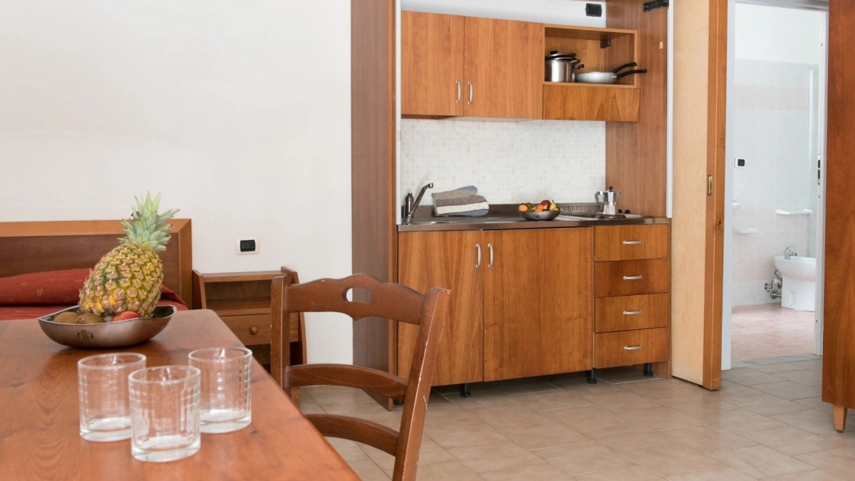 Apartmán mono pro 4-5 osob (typ B) – pokoj rozdělený dlouhou stěnovou skříní na ložnicovou a obývací část s dvoulůžkovou rozkládací pohovkou, možnost 5. lůžka na vyžádání zdarma; v přízemí.