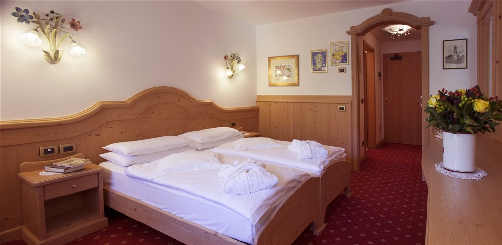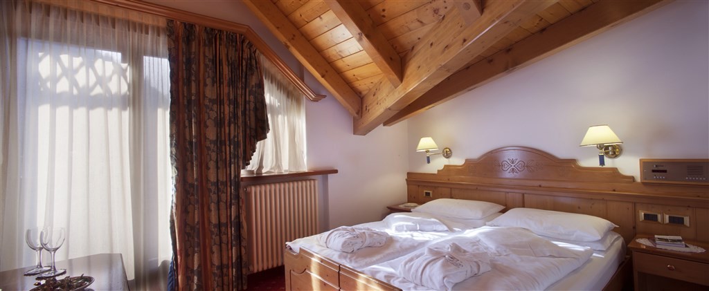 - Junior Suite Dolomite: cca 30 m2, manželské dvoulůžko nebo 2 oddělené postele, 2 přistýlky formou rozkládací pohovky, orientace do dvora (omezený výhled a přísun denního světla).