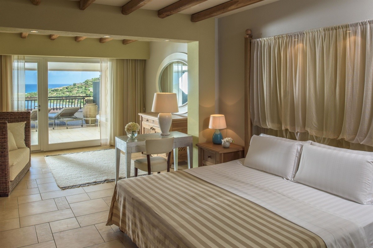 - 41–45 m², Junior Suite, horní patro, výhled na moře, posezení, pohovka, manželská postel, 1 koupelna, sprcha nebo vana, toaleta, župan, klimatizace, minibar (za poplatek), trezor, 1 TV, Wi-Fi, kávovar, balkon nebo terasa