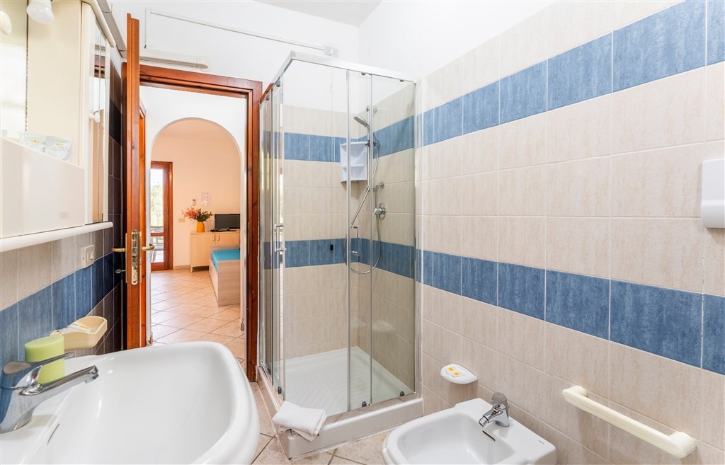 Ubytování bylo čisté, vybavené vším potřebným. V kuchyni plynové plotýnky, rychlovarná konvice, mikrovlnka, lednice s mrazákem a navíc myčka na nádobí. V balíčku, která jsme dostali, bylo malé balení mycího přípravku, několik tablet do myčky, houbička na nádobí a sáčky do koše. K vybavení patří i pračka, což jsem uvítala, kvůli možnosti přeprat prosolené ručníky z pláže. Koupelna měla uzavíratelný sprchový kout, velké umyvadlo s galerkou , WC a bidet. K dispozici byl fén, mejdlíčka a sprchové gely v hotelovém balení. Ručníky byly za příplatek, což jsem v materiálech od cestovky přehlédla a museli jsme si tedy zaplatit zapůjčení. V apartmánu byl také malý slunečník, který jsme si brali na pláž. V ložnici klasické dvojlůžko s nočními stolky a velkou skříní, kde bylo dostatek ramínek na šaty. Klimatizace byla umístěna mezi místnostmi, takže nejvíc foukala do kuchyně a do ložnice minimálně. V oknech i dveřích jsou sítě proti hmyzu, před vchodem prostorná terasa s posezením. Důsledně se zde třídí odpad, takže v zadní části jsou umístěné nádoby na odpady (přístup dveřmi z ložnice).