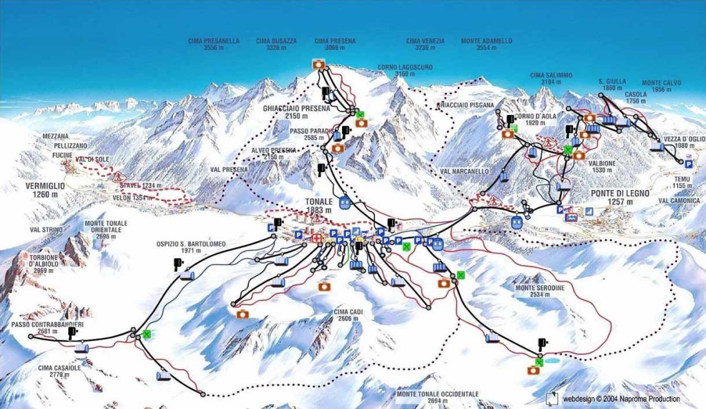 Sjezdovky všech náročností super, hlavně v dopoledních hodinách, výhodou je spojený skipass s Passo Tonale a Ponte di Legno.