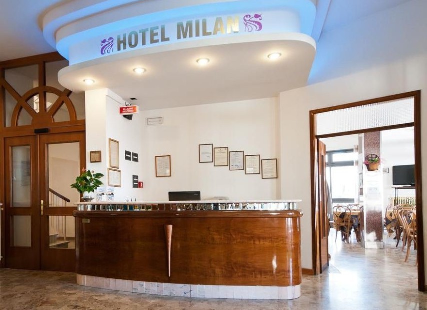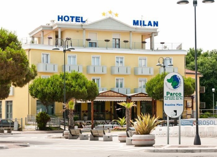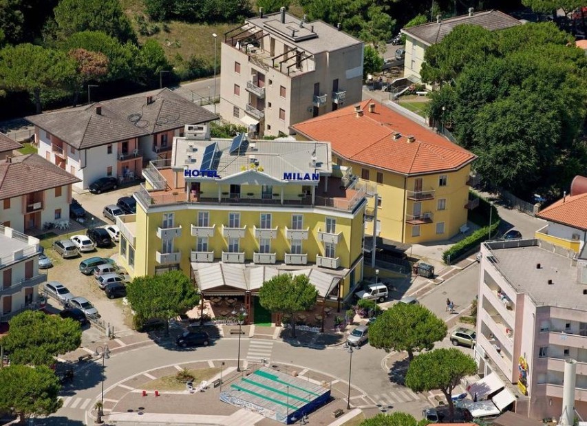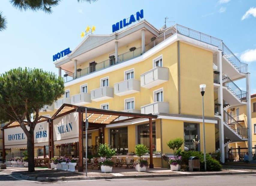 Rodinný hotel MILAN*** (Piazza San Giorgio) leží přímo v menším centru letoviska a zároveň blízko písčité pláže. Hotel má již mnohaletou tradici italské rodiny, která se stará o spokojenost svých hostů. Součástí hotelu je recepce, výtah, restaurace, bar, Wi-Fi, oplocené parkoviště, privátní pláž a půjčovna kol (za poplatek). Všechny pokoje mají vlastní sociální zařízení, fén, TV/SAT, trezor, telefon, Wi-Fi, klimatizaci a balkon, pokoje Superior s výhledem na moře.