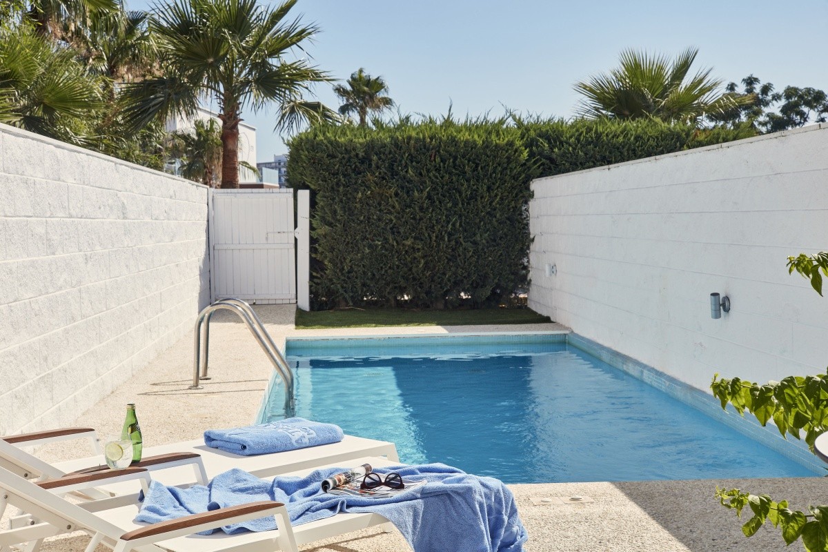 Moderně zařízená, prostorná dvoulůžková studia s možností přistýlky jsou vybavena sociálním zařízením (sprcha a vana, toaleta, fén), kuchyňským koutem (základní nádobí, chladnička, elektrická trouba, rychlovarná konvice, toustovač), telefonem, klimatizací, rádiem, satelitní TV, trezorem a balkonem nebo terasou s posezením. Prostornější suity s privátním bazénem a pokoje s výhledem na moře jsou k dispozici na vyžádání (za poplatek). Dětská postýlka a vysoká jídelní židlička je k dispozici na vyžádání (zdarma). WiFi na pokoji je k dispozici zdarma. Ubytování je nekuřácké.
