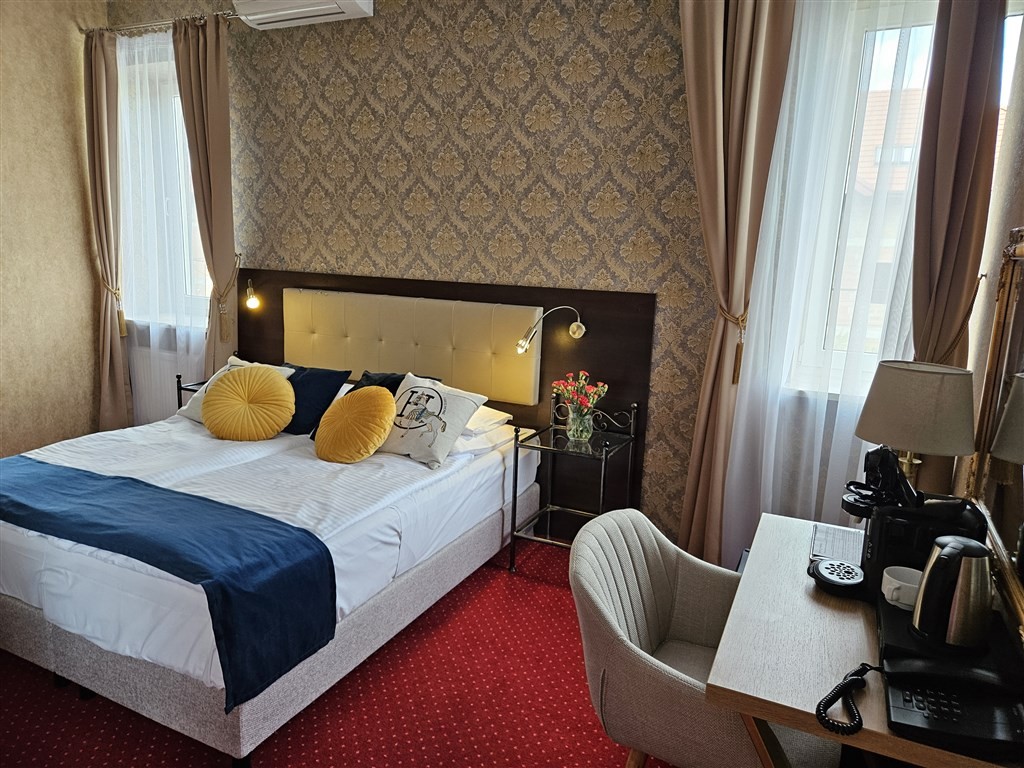 2 - lůžkové pokoje STANDARD, Spr.+WC, SAT/TV, telefon, Wi-Fi, minibar, fén (pokoje mají pouze oddělená lůžka). 3-lůžkové a rodinné pokoje na dotaz vč. ceny. Hotel nedisponuje pokoji s balkonem.