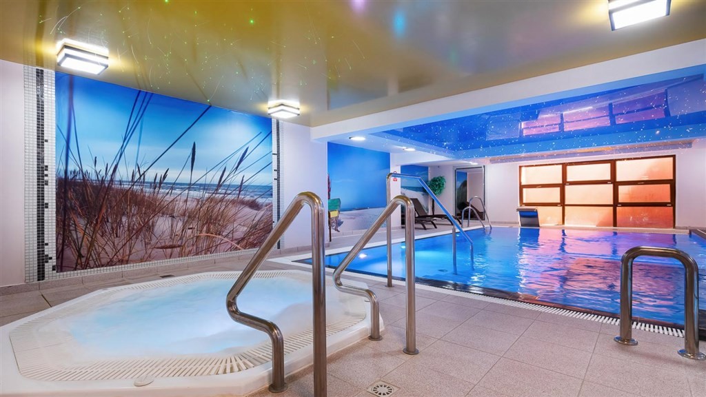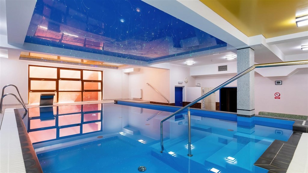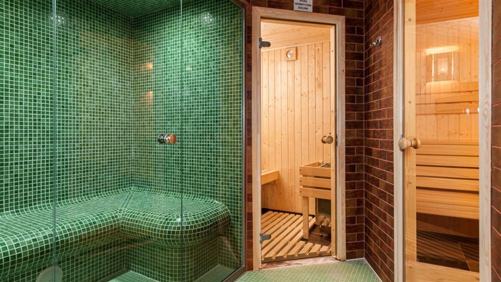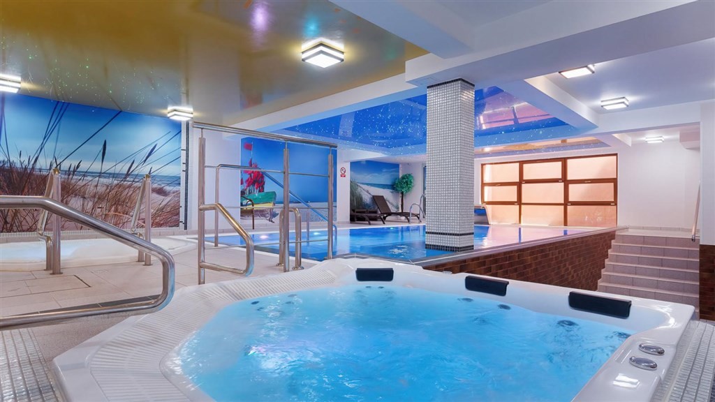 jídelna, bazén, brouzdaliště pro děti, vířivka a sauny (finská, aroma, bylinková a parní lázeň), dětské hřiště, parkoviště
