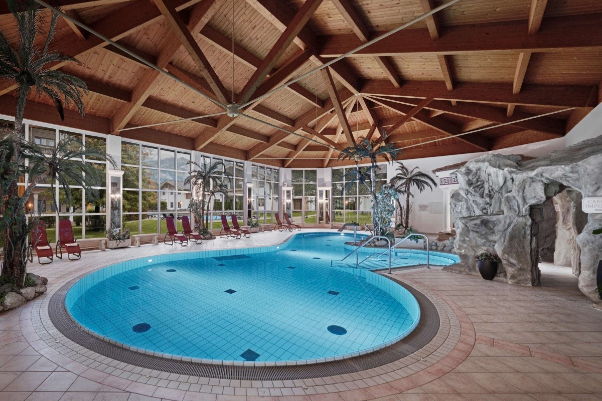 - 800 qm großes Römerbad mit Indoor- und Outdoor-Pool sowie SPA- und Wellnessbereich, u. a. Biosauna, Dampfbäder, Aromagrotte