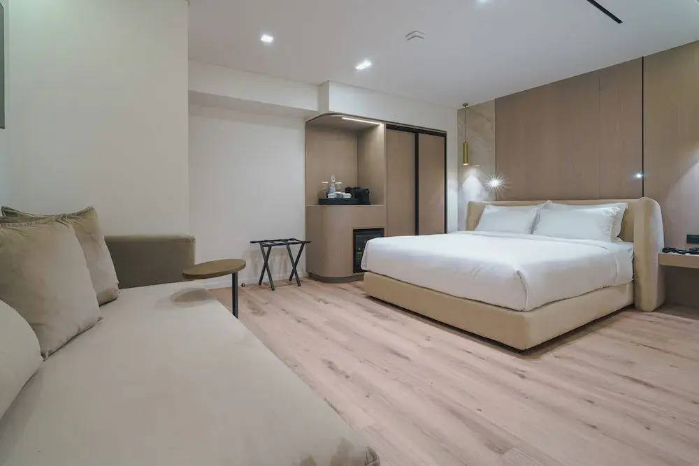 Unikátní designové apartmá o jedné místnosti s manželskou postelí King size a posezením, které nabízí panoramatický výhled na Akropoli v maximálním pětihvězdičkovém luxusu.