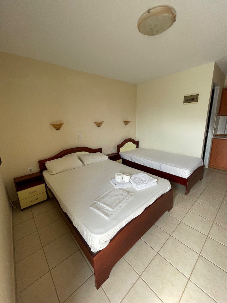 - 2-3 lôžkové štúdio: V krídle „A“ sa nachádzajú 2-3 lôžkové štúdiá s balkónom, ktoré majú bočný výhľad na vnútorné nádvorie/susedný dom a more. 2-3 lôžkové štúdiá v krídle „B“ sú vybavené balkónom, nie sú oddelené od spoločného schodiska a majú obmedzený výhľad. Prístelka pre 3. osobu je bežná posteľ.