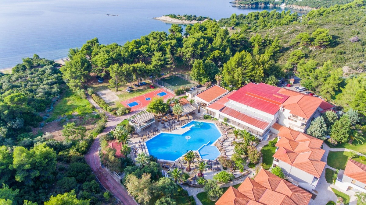 Poloha: V klidném, idylickém místě, obklopeném krásnou přírodou a přímo u krásné písečné zátoky (prokládané drobnými oblázky). Nejbližší město Neos Marmaras je vzdálené přibližně 11 km (kyvadlová doprava jezdí 3krát denně).
