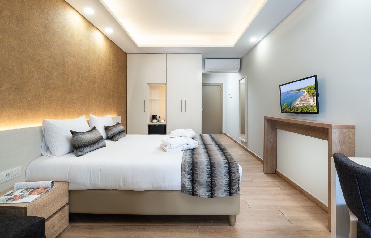 Bydlení: Dvoulůžkový pokoj (dvoulůžkový pokoj, cca 20 m2), moderně a atraktivně zařízený, klimatizace, lednička, TV, WiFi, telefon, trezor. Otevřený sprchový kout, WC, vysoušeč vlasů. Balkon nebo terasa. Max. 2E+1K