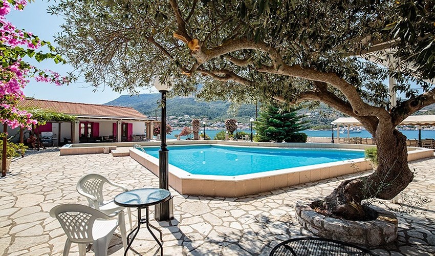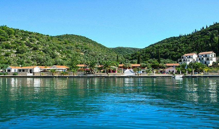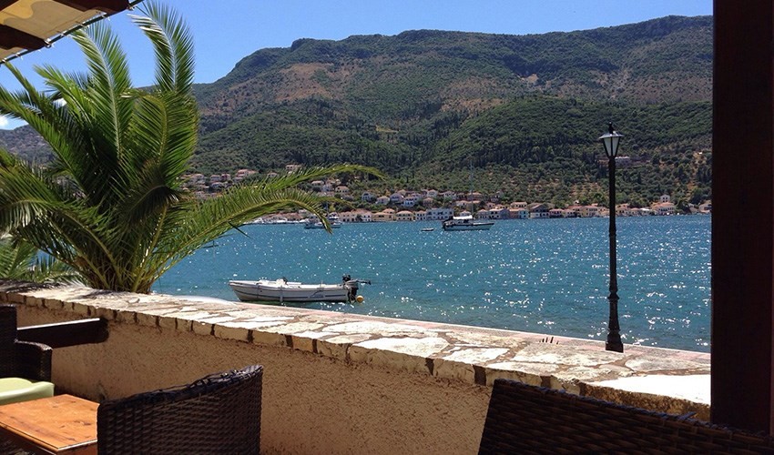 přímo na nábřeží města Vathy s výhledem na zátoku
