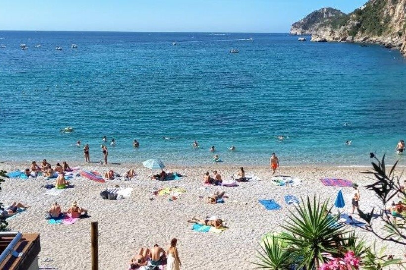 Prístup na pláž po schodoch. Nevhodné pre ľudí s handikepom sťaženej chôdze. Pláž vzhľadom na prírodné podmienky dobrá. Platené slnečníky na 3/4 pláže. Kúpať sa dá len na okrajoch pláže. Stred zaberá mólo pre loďky z oboch strán móla. Možnosť zapožičať si za poplatok šliapadlo alebo čln s volantom na vodičský preukaz. Vývoz a zvoz z pláží v okolí. Hostia hotela majú výrazné zľavy. Platené slnečníky 15 Eur na deň. Sprcha je len na jednom konci pláže. WC pri bare nad plážou. Na časť pláže bez slnečníkov vytekajú splašky a je tam neporiadok zo zvyškov lehátok a slnečníkov. Na pláži hrubší piesok a kamienky. Prirodzený tieň končí po 12:00 a bez slnečníka sa na priamom slnku nedá vydržať. Voda číra, vstup sa strmo zvažuje. Vo vode sú kamienky, nutná obuv do vody (najmä zo začiatku). Vlnky od lodiek vadia pri plávaní. Šnorchlovanie možné pri skalách po bokoch pláže, vlastná prenosná bójka potrebná.