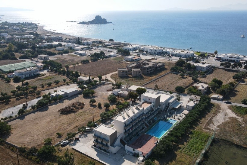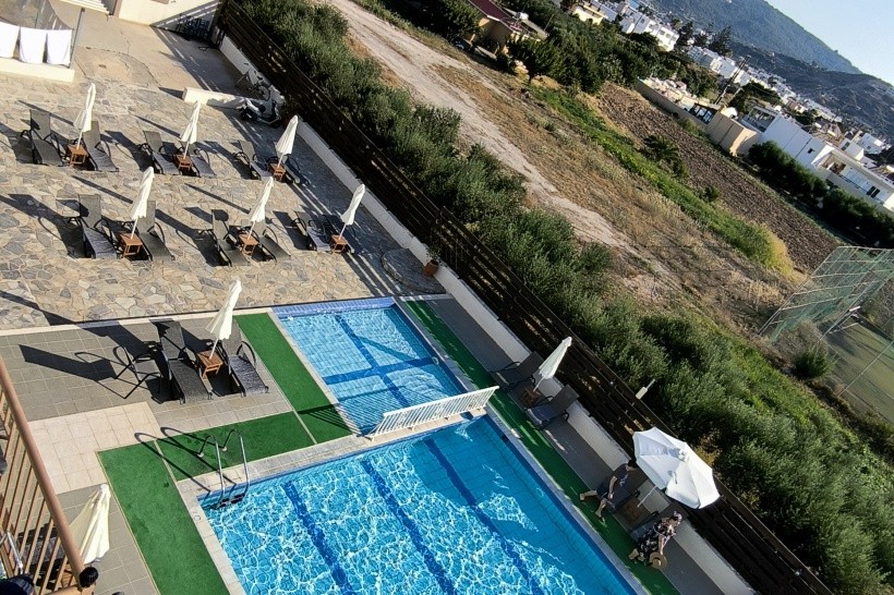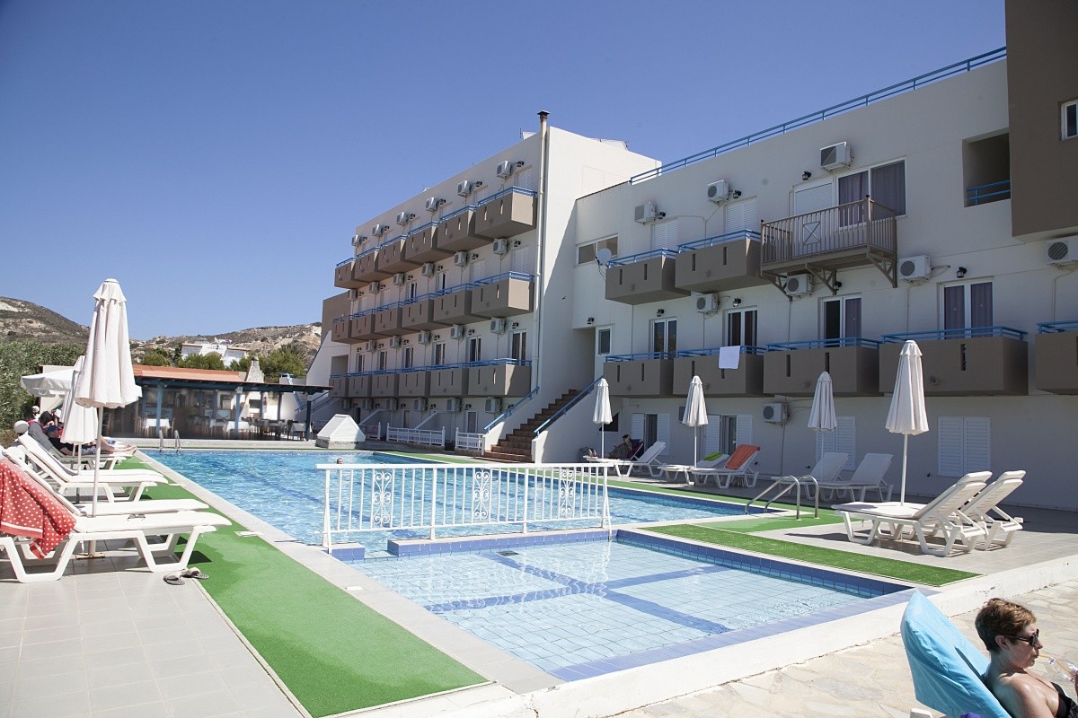 Rodinný hotel blízko pláže. Dobrý bazén. Jednoduché pokoje. Výhled na moře, hory a ostrovy z horních pater.