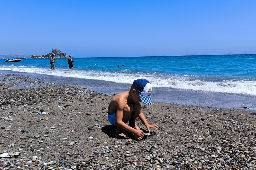 Pár minut chůze na pláž, pěkný výhled z pláže na ostrov a hory, dlouhá pláž, nepřeplněná. Slunečník se 2 lehátky 15 eur.