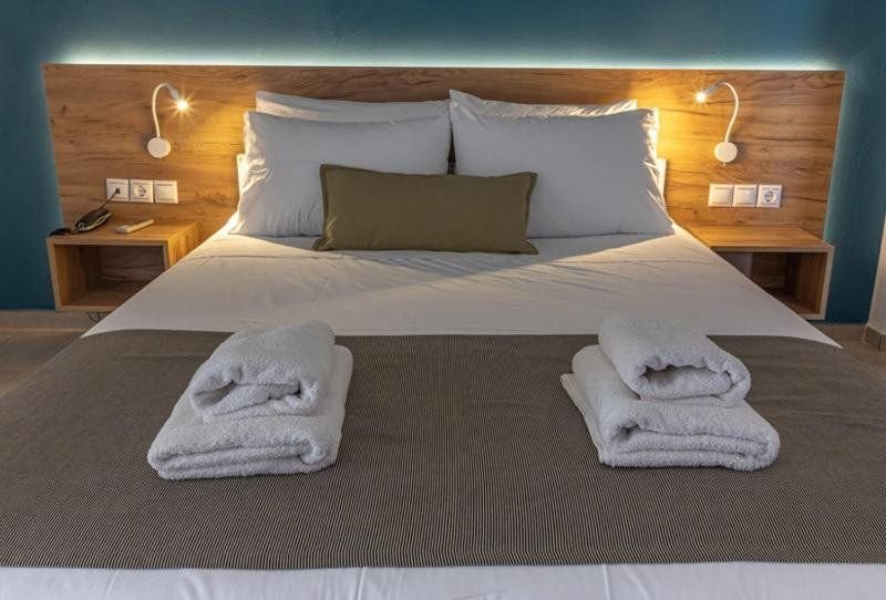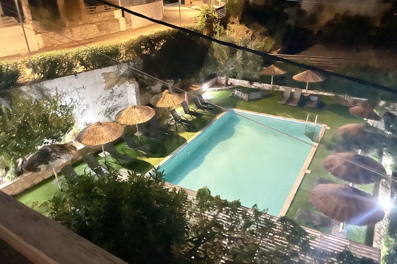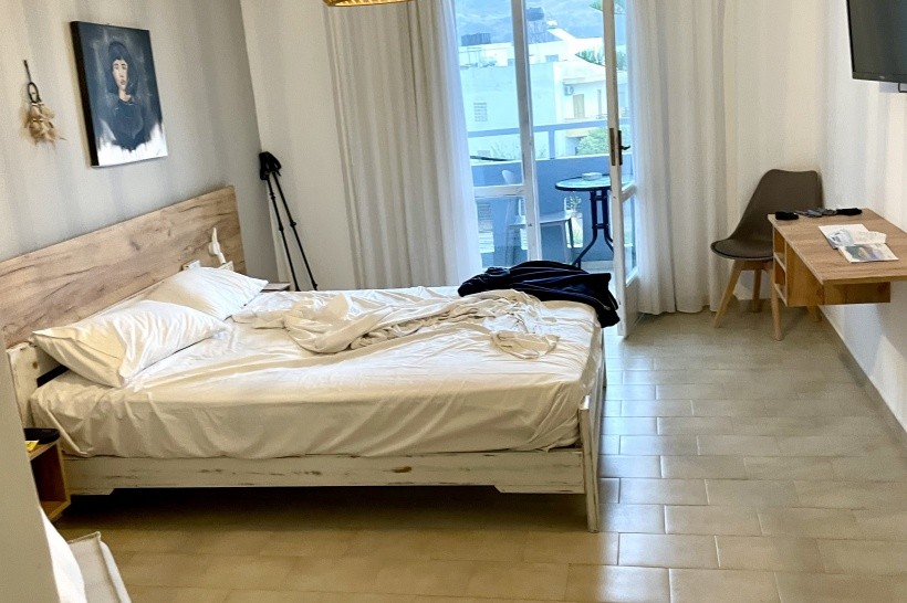 Hotelový pokoj byl pěkný, moderně vybavený s balkonkem a výhledem na moře. Koupelna moderně vybavená, jen sprchový kout by zasloužil celkově lepší úklid. Ve sprše i u umyvadla tekuté mýdlo v jedné nádobě, což je eko úspornější i když měli jsme své. Klimatizace fungovala, na pokoji byl i trezor a lednička s dvěma lahvemi vody. Každý den ustláno, ručníky měnili jen jednou. Velký a malý. Když jsme přijeli, jeden byl nepříjemně cítit. Další už ok. Nevýhoda pokoje , že je ve třetím patře bez výtahu. Při příjezdu nám byly kufry doneseny až nahoru velmi milým personálem, dolů už sami.Problém s toaletním papírem do koše je asi v celém Řecku- byl by dobrý bidet vedle záchodu. Jinak jsme byli s ubytováním spokojeni.