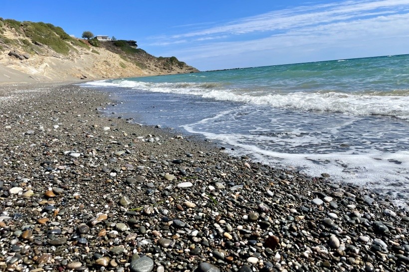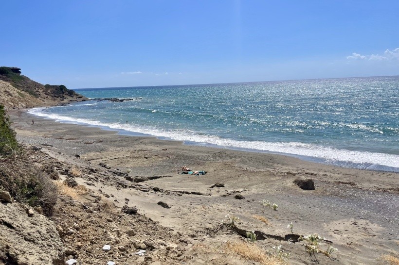 Pláž u hotelu byla z velké části zanesená velkým nepořádkem po bouři, který celý týden nikdo neuklízel. Bylo však možné popojít kousek vedle, kde bylo čisto a všude pozvolný vstup až na trochu kamení, které přinášelo moře. Nebo se dalo jít dál do zálivu, kde téměř nikdo nebyl a po projití trochy navalených kamínků příjemný písek a pozvolna se svažující dno.Tato strana pobřeží je větrnější, takže není nouze o vlny, ale když je horko, tak větřík přijde vhod. Ježci tam téměř nejsou, viděla jsem jich pár jen mezi skalami. Moře a i pláž je zde každý den jiná podle počasí. Jeden den moře jak stůl a druhý den velké vlny. Jeden den pláž čistý písek a druhý den plná oblých, krásných kamínků. Koupání velice pěkné.