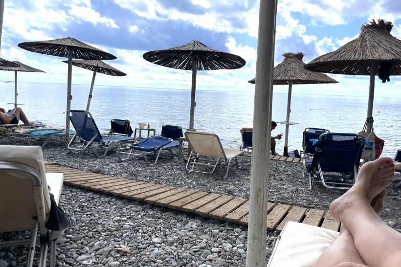 pláž přímo před hotelem na pohled s horším přístupem do moře (balvany), ale lehátka by se tam asi vždy volná našla. Nádherná prostorná přírodní písčitá pláž s oblázky a s písčitým pozvolným přístupem do moře cca 500 - 650 m po rovině od hotelu, (teď) téměř bez lidí. Jasně že bez lehátek a slunečníků.