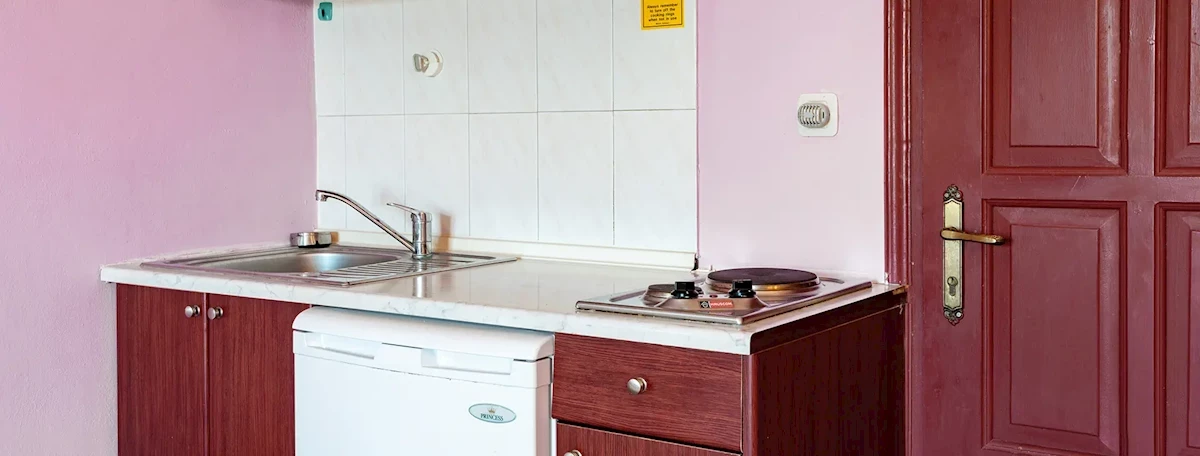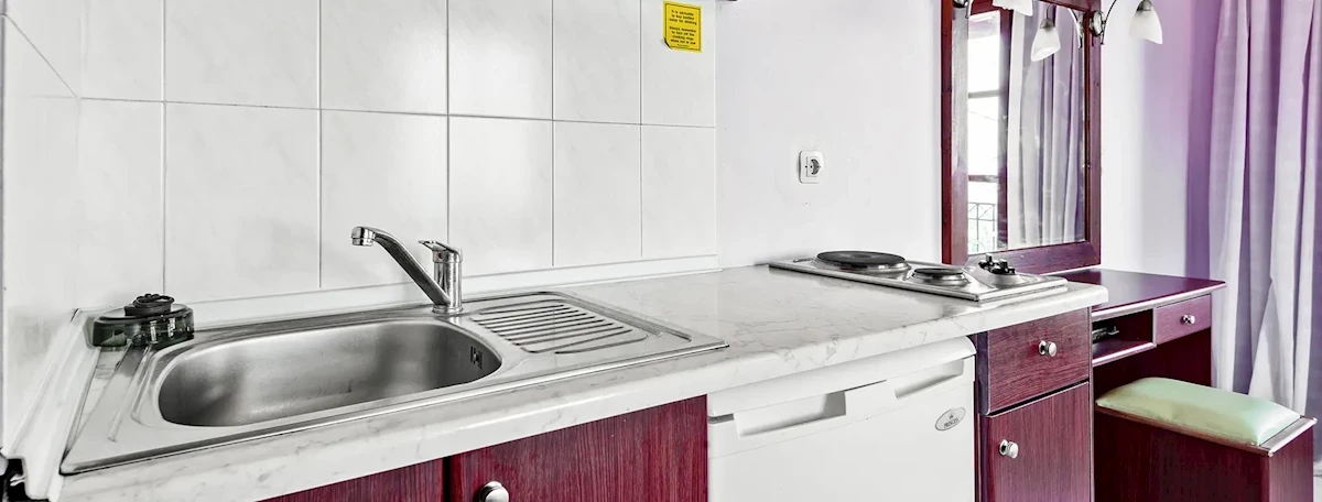 Útulně zařízená prostorná dvoulůžková studia s možností přistýlky jsou vybavena sociálním zařízením (sprcha nebo vana, toaleta, fén), telefonem, klimatizací, satelitní TV, žehličkou, kuchyňským koutem (základní nádobí, vařič, lednice, rychlovarná konvice, mikrovlnná trouba, kávovar) a prostorným balkonem nebo terasou (výhled na moře, do zástavby nebo do zeleně). Dětská postýlka a vysoká jídelní židlička je k dispozici na vyžádání.Strava