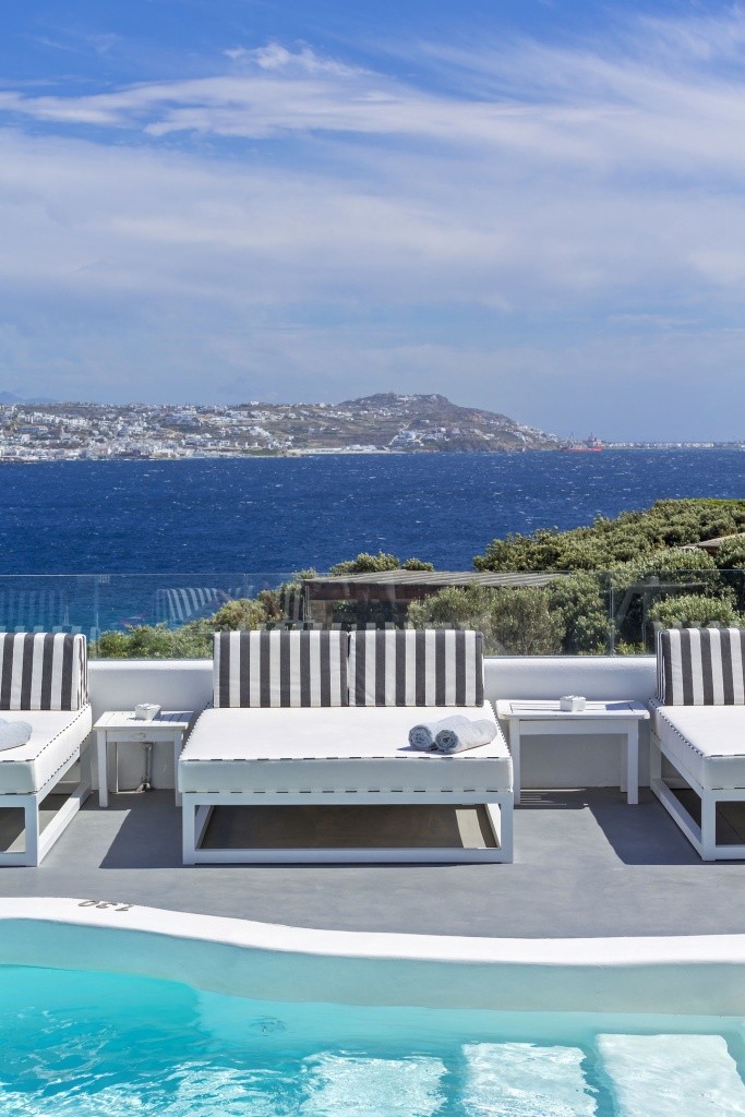 Poloha: ve svahu nad úzkou, jemnou písečnou pláží Agios Stefanos (vzdálená cca 50 m), s fantastickým výhledem na město Mykonos (vzdálené cca 3 km).