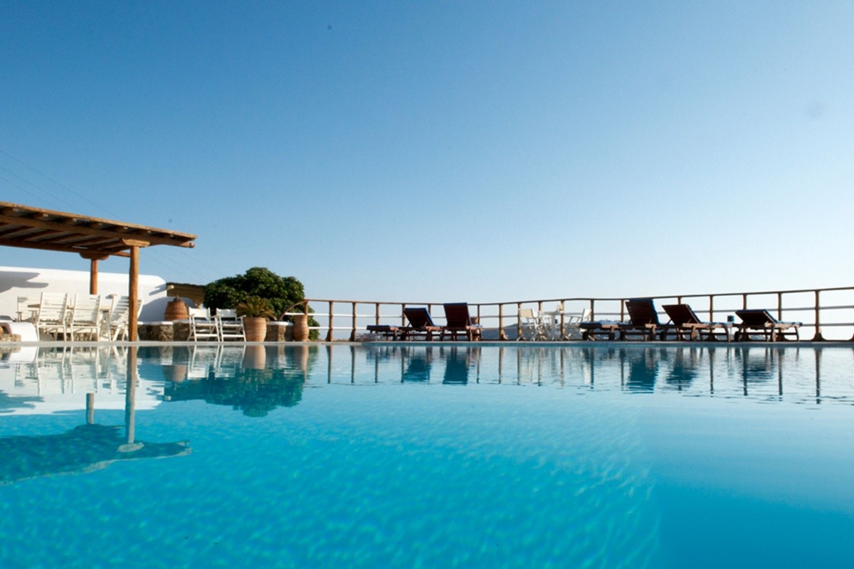 Jen málo míst nabízí tak krásný západ slunce jako svahy Mykonosu. Hotel v kubickém stylu se pyšní okouzlujícím výhledem na město a vyzařuje řecký způsob života!