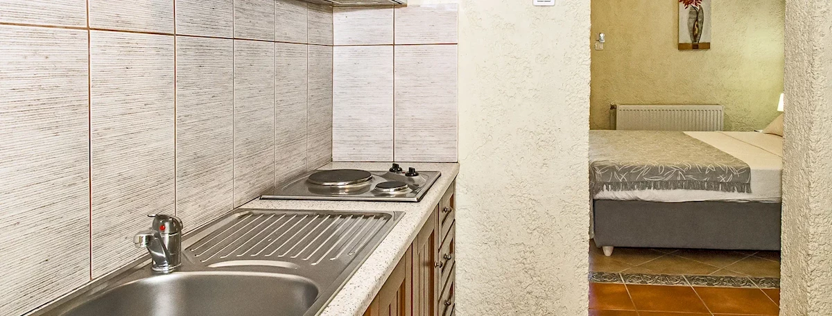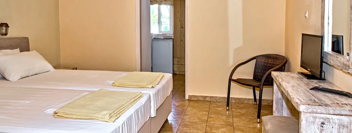 Prostorná a dobře vybavená studia mají obývací pokoj, který slouží i jako ložnice pro dvě osoby, kuchyňský kout se základním vybavením (lednice, nádobí a příbory), koupelnu s toaletou a malý balkon/terasu se zahradním nábytkem. K dispozici je také satelitní TV a klimatizace (individuálně nastavitelná, přibližně 5 € na den). Ručníky a čisticí prostředky jsou k dispozici. Dětské postýlky nejsou k dispozici.