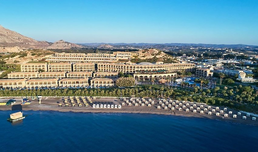 Luxusní hotelový resort, který je součástí prestižní sítě hotelových řetězců je situován na atraktivním místě, přímo u krásné písčito-oblázkové pláže nedaleko centra malebného letoviska Kolymbia. Nákupní možnosti a zábavu mají hosté jen 5 minut chůze od ubytování (obchody, taverny, restaurace, tradiční trh, vodní sporty na pláži, půjčovny automobilů a motocyklů, turistické atrakce). Mezinárodní letiště Rhodos je vzdáleno 35 km.
